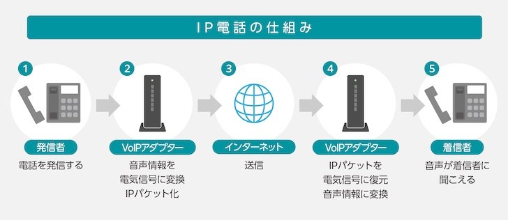 - 着信者:VoIPアダプターでIPパケットを電気信号に復元し、音声情報に変換する