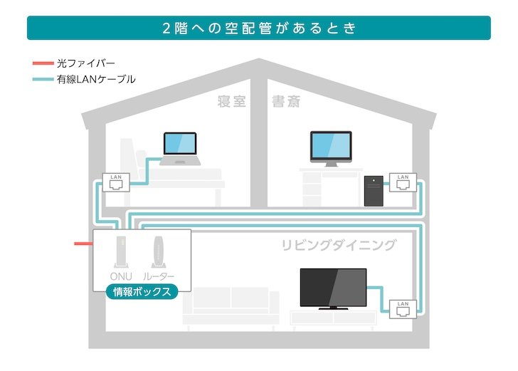 配線のレイアウトは、LAN工事業者に依頼する前にある程度決めておくのがおすすめです。ルーターと各デバイスとの距離や位置関係、さらには人の導線なども考慮してレイアウトを決めておくと、工事業者との打ち合わせがスムーズに進みます。