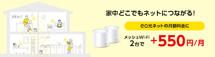 また、有線LANでインターネット通信の基盤をしっかり作りつつ、別室配線が必要な箇所はメッシュWi-Fiで補うのも一つの手でしょう。ケーブルが届かない場所をカバーする際には、「eoメッシュWi-Fiレンタルサービス」をご活用ください。