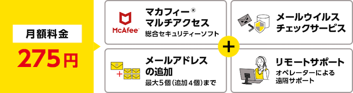 「eoセキュリティーパック」では、パソコンでもスマートフォンでも5台まで使えるセキュリティーソフト「マカフィー マルチ アクセス」で、ウイルス対策からフィッシング対策・パスワード管理まで行えます。加えて新しいメールアドレスとメールボックスを4つまで追加可能で、メールウイルスチェックサービスも受けられるため、スパムメール対策としても有効です。