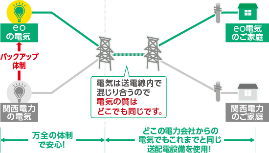 万が一eo電気の供給元電源にトラブルが生じても、自動で関西電力にて不足分を補うため、供給に支障はありません。