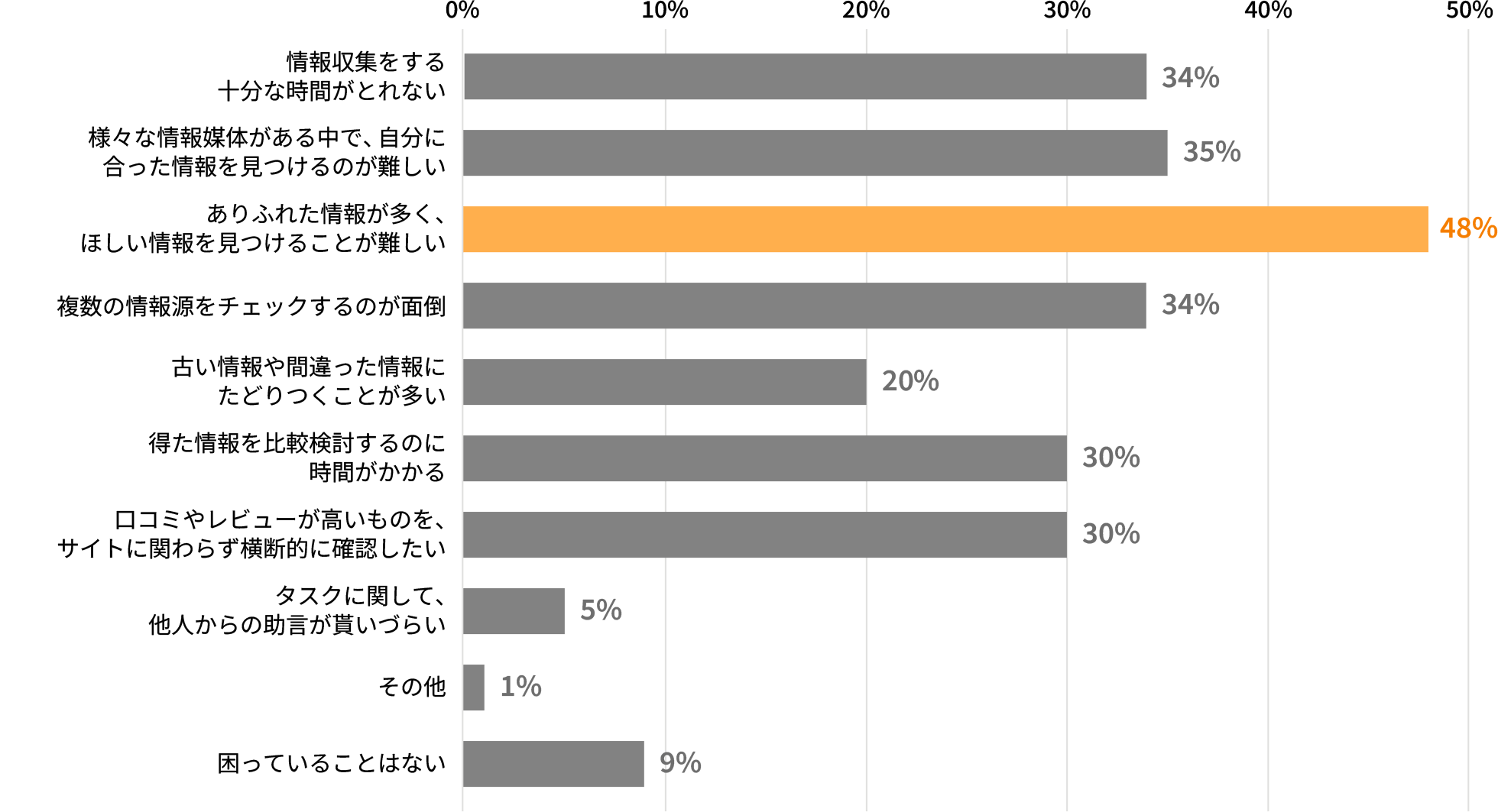 普段、プレゼントの購入や外出先・旅行先の検討などで情報収集する際に、どのようなお困りごとがあるかお聞きしました。特に、ありふれた情報の中から欲しい情報を見つけることが難しいという課題が多くみられました。自分に合った、少しユニークな提案を求めていることがうかがえます。