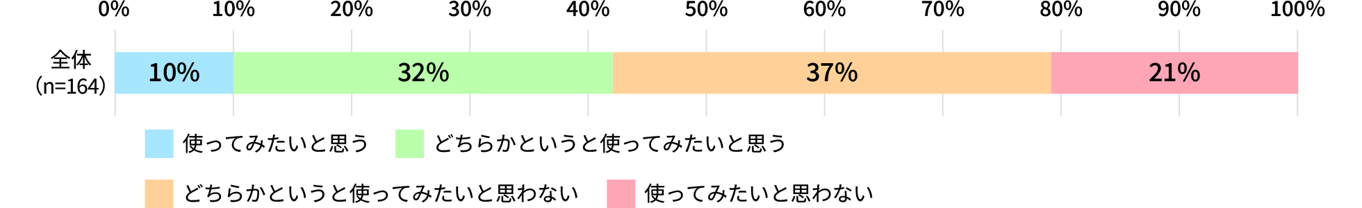 「使ってみたい」「どちらかというと使ってみたいと思う」と回答された方は42%、「使ってみたいと思わない」「どちらかというと使ってみたいと思わない」と回答された方は58%となり、意見が分かれる結果となりました。