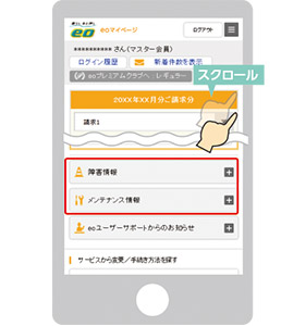 スマートフォンからeoID・eoIDパスワードでログインしていただくと、障害やメンテナンスが発生していないか、弊社設備からお客さま宅までの光ファイバーケーブルに異常がないか…などを診断し、その場でできる対処方法を表示します。ぜひご活用ください。