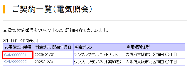 ※「ご契約一覧画面」が表示された場合、ご契約中のeo電気契約番号を選択してください。