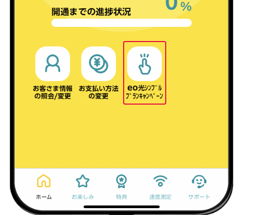 eoアプリログイン後、ホーム画面の「eo光シンプルプランキャンペーン」ボタンをタップする